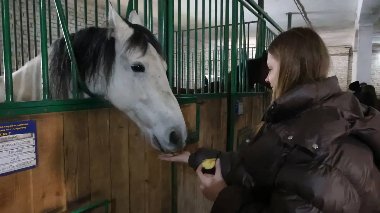 После серьезной теоретической части ребят ожидало общение с четвероногими помощниками полицейских — они посетили кавалерийское отделение и с удовольствием покормили полицейских коней вкусной морковкой.