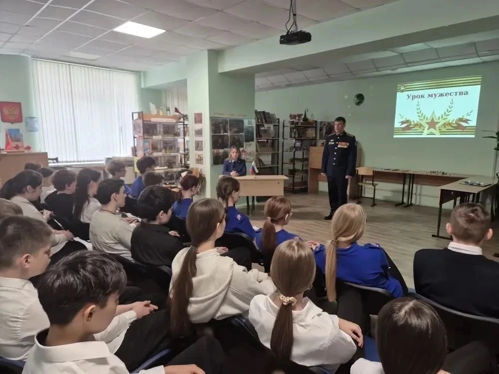 Своими рассказами о военных событиях со школьниками военнослужащий, участник специальной военной операции, ветеран боевых действий в Сирии Алексей Райнбагин. Прозвучавшие истории о патриотизме, мужестве и героизме вызвали неподдельный интерес у ребят.