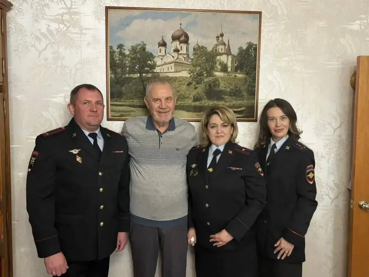 Ветерана навестили заместитель начальника управления Госавтоинспекции подполковник полиции Алексей Смятский, начальник отделения пропаганды БДД майор полиции Елена Юдина и старший инспектор отделения пропаганды БДД капитан полиции Лилия Глухова - внучка ветерана.