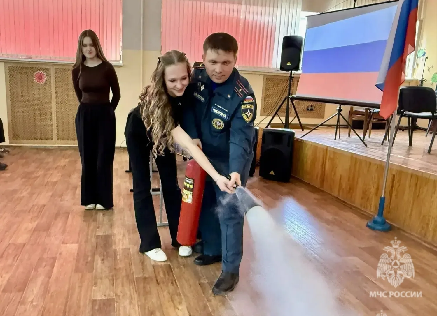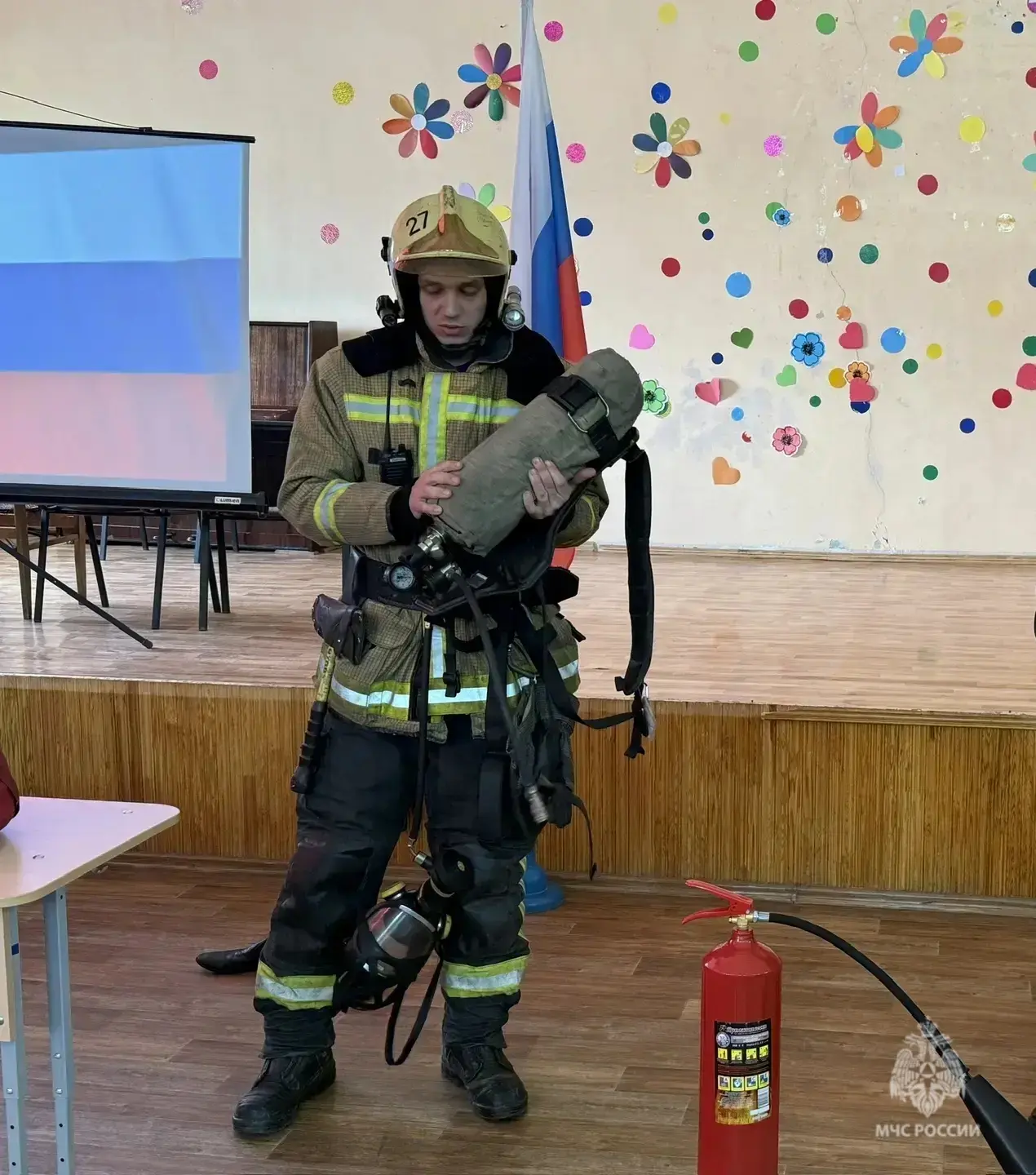 Представитель ведомства Николай Чимаров рассказал о профессии пожарного, напомнил правила пожарной безопасности, а также научил детей пользоваться огнетушителем.