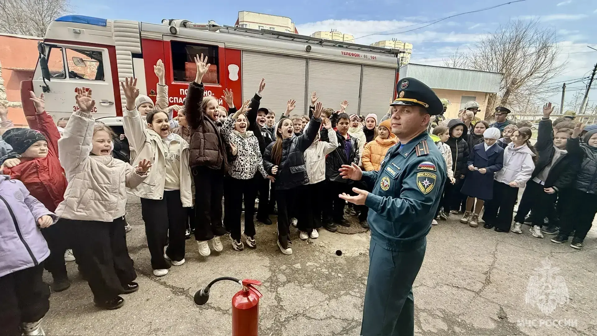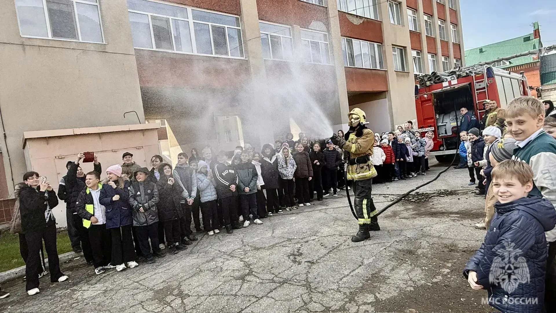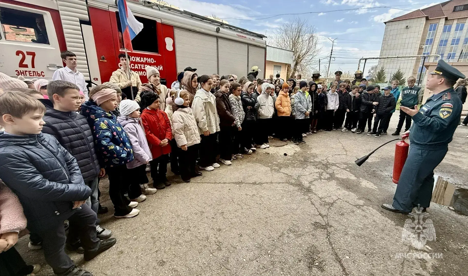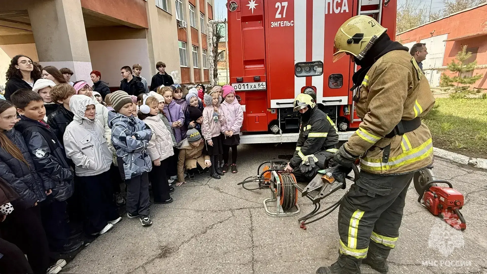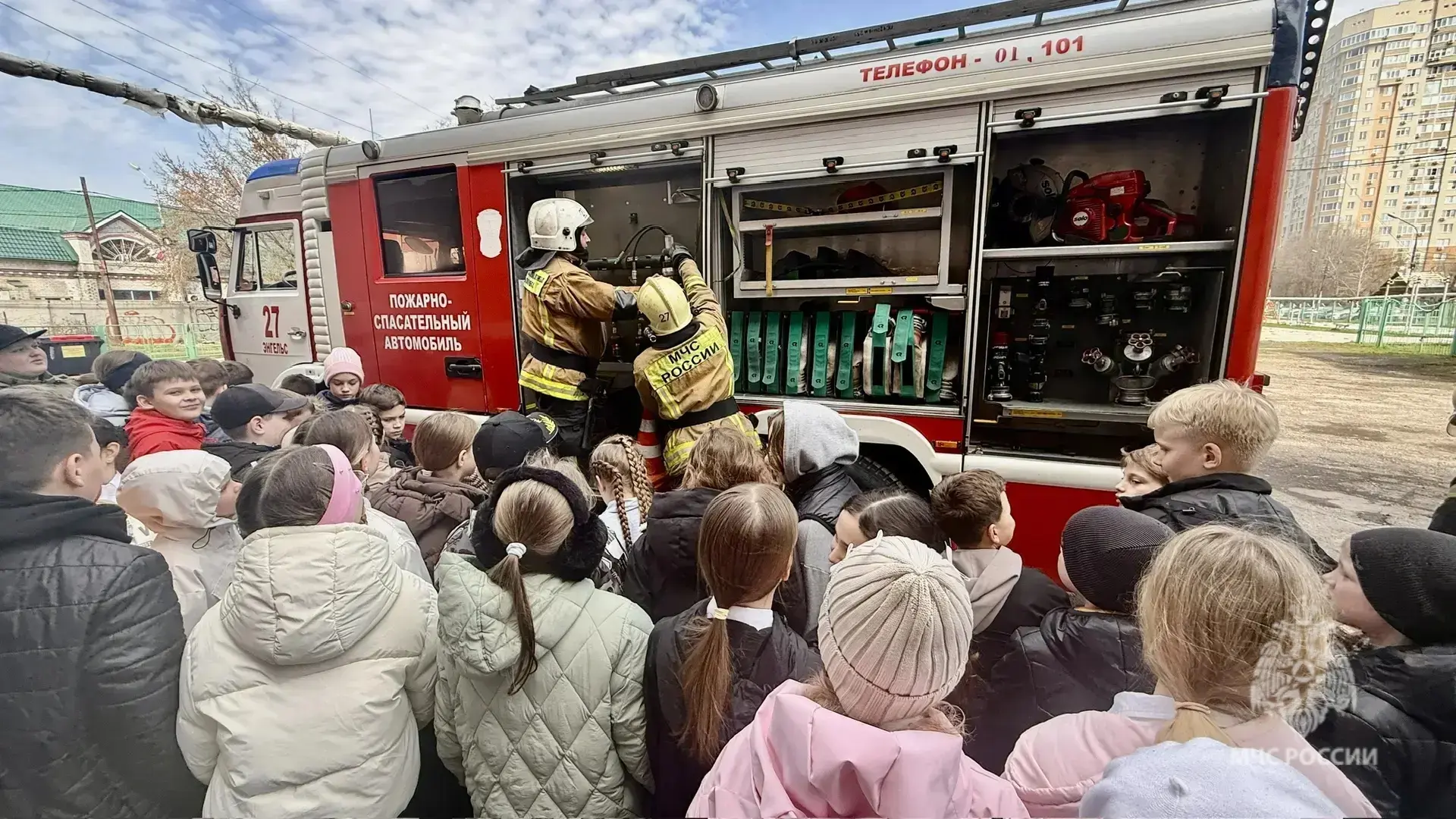 Огнеборцы пожарно-спасательной части № 27 по охране города Энгельса разрешили ребятам примерить боевую одежду пожарного, а также продемонстрировали сбор-выезд по тревоге и работу на месте условной ЧС.