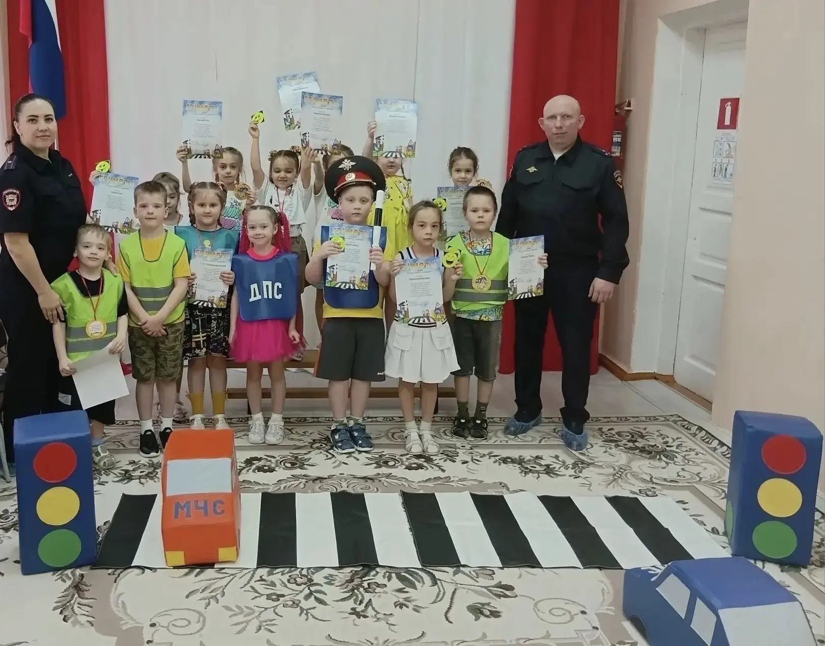 В завершении встречи сотрудники полиции призвали ребят соблюдать Правила дорожного движения и вручили дошколятам световозвращающие элементы, медали и грамоты знатоков ПДД.