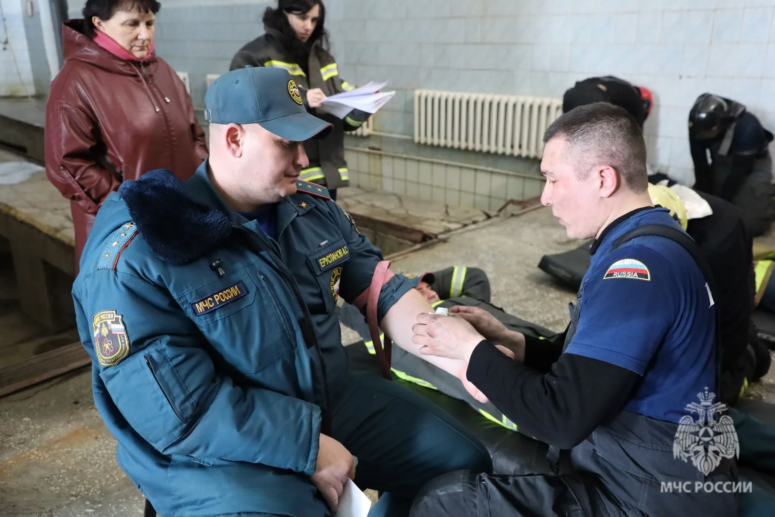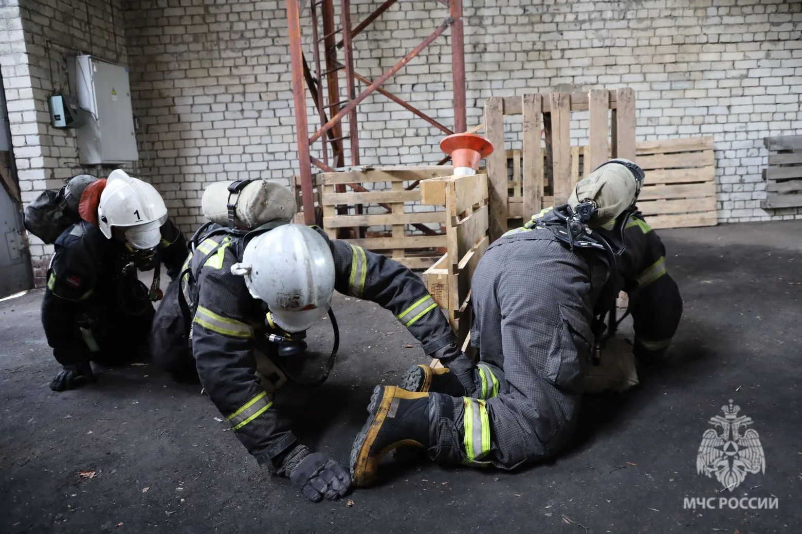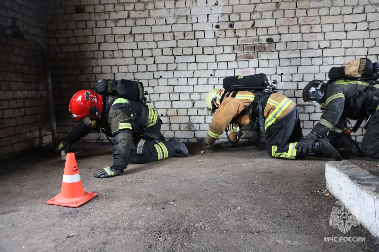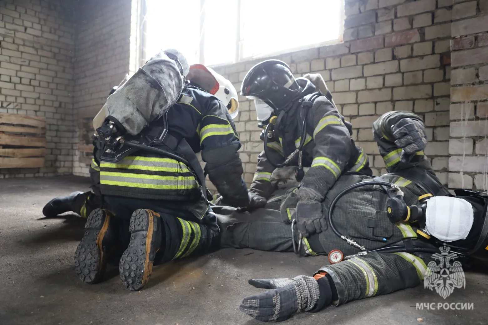 В дымокамере в полном отсутствии видимости участники ищут маяки-спасатели, эвакуируют на улицу пострадавшего.