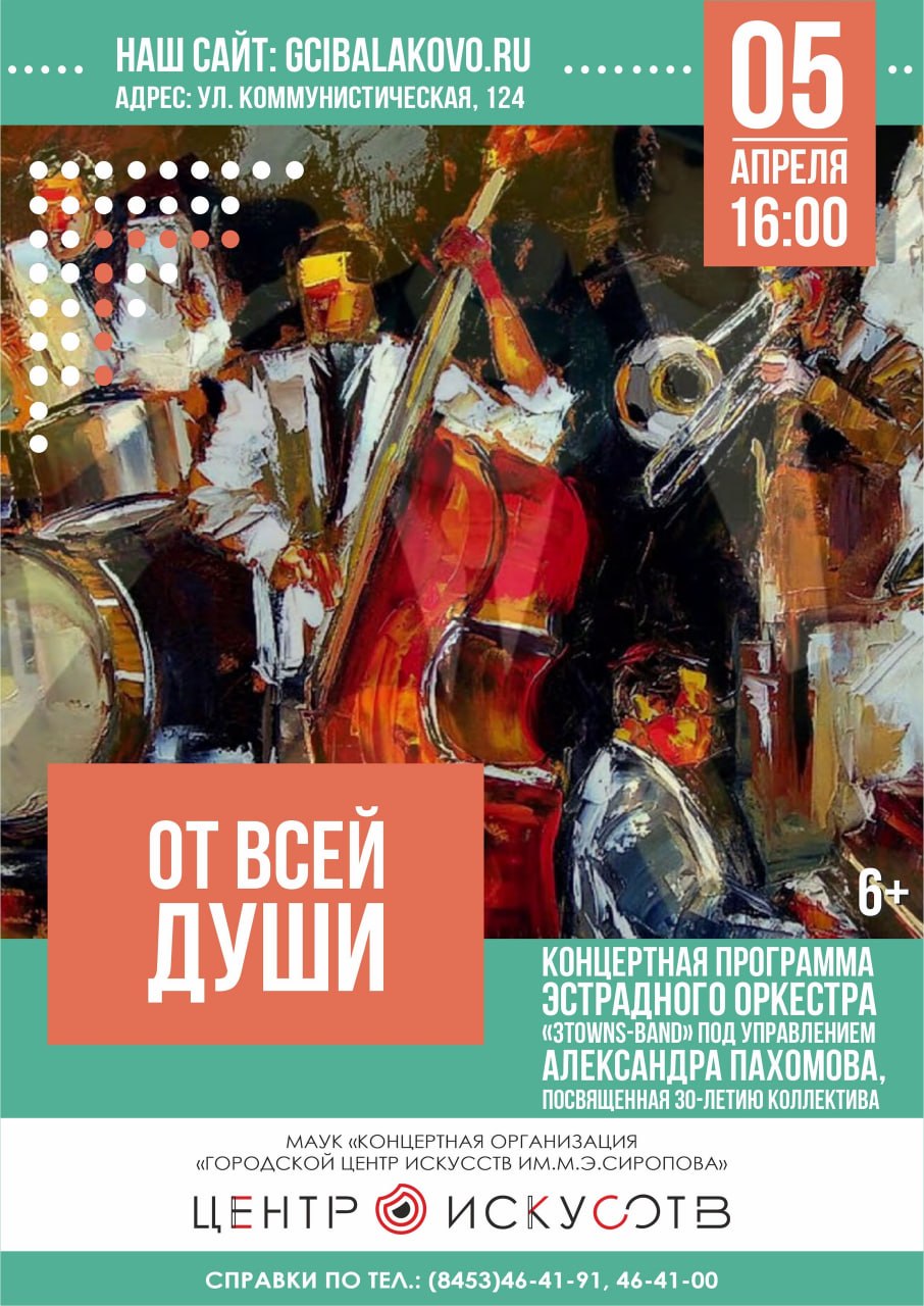 5 апреля в 16.00 в Городском центре искусств состоится юбилейный концерт «От всей души» эстрадно-джазового оркестра «3Towns-band»!