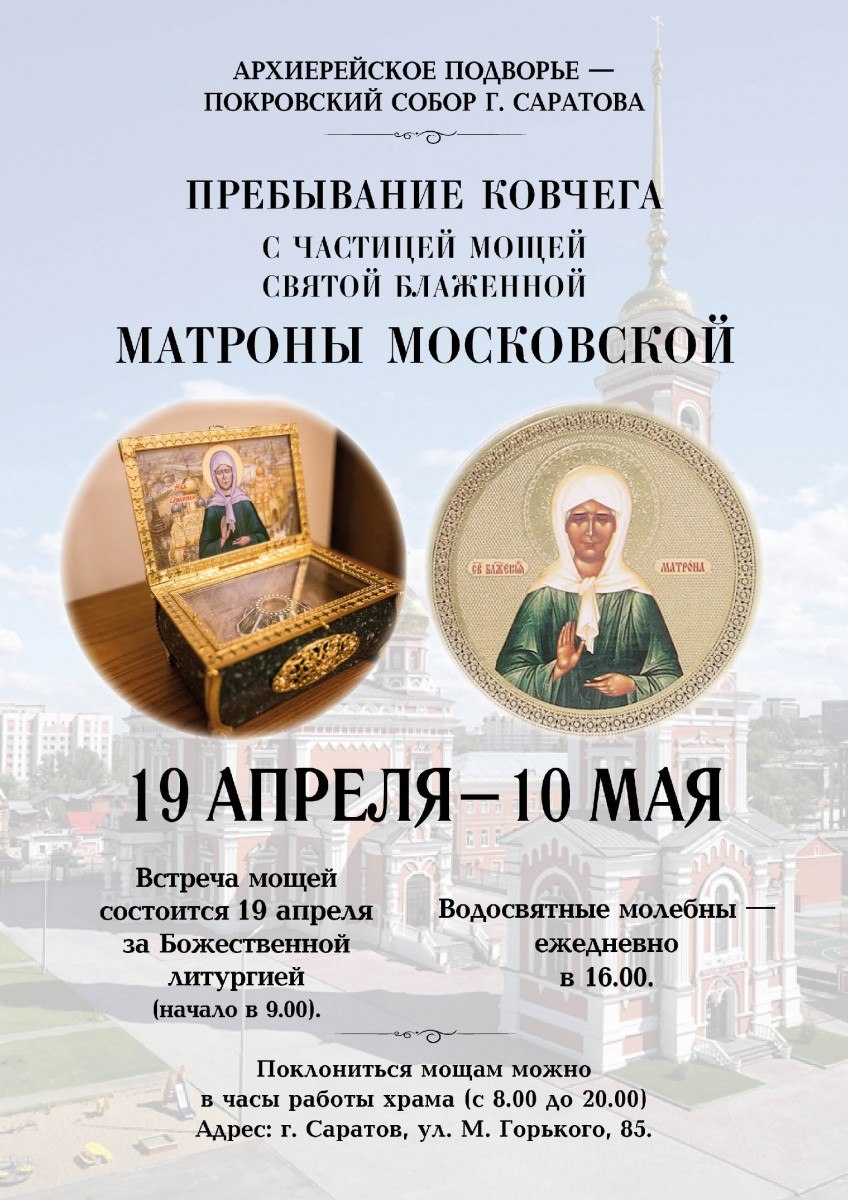 С 19 апреля по 10 мая в Покровском соборе Саратова будет пребывать ковчег с частицей мощей святой блаженной Матроны Московской.