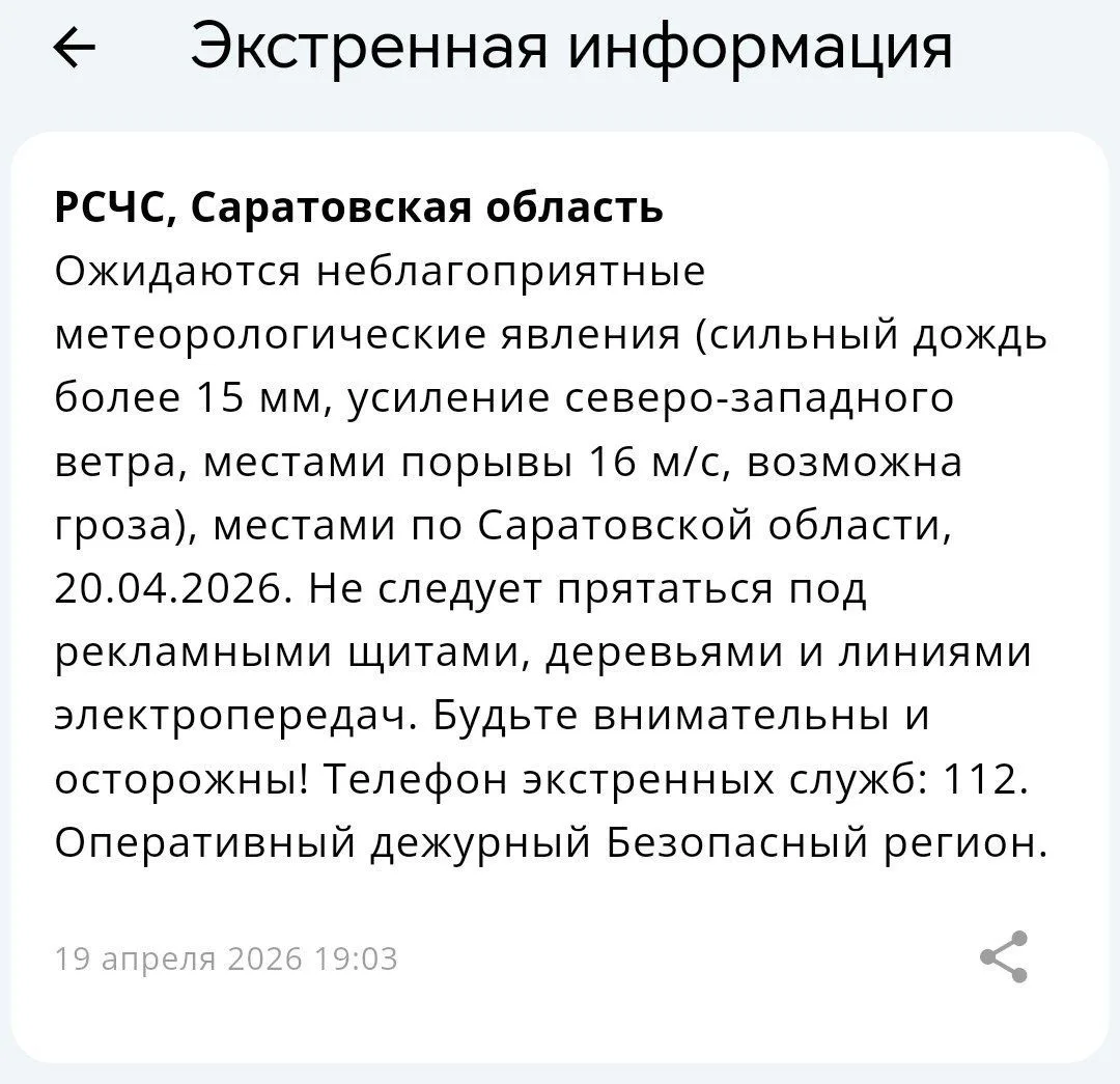 "Экстренная информация РСЧС*: Ожидаются неблагоприятные метеорологические явления (сильный дождь более 15 мм, усиление северо-западного ветра, местами порывы 16 м/с, возможна гроза), местами по Саратовской области, днем 20.04.2026", — сказано в уведомлении.
