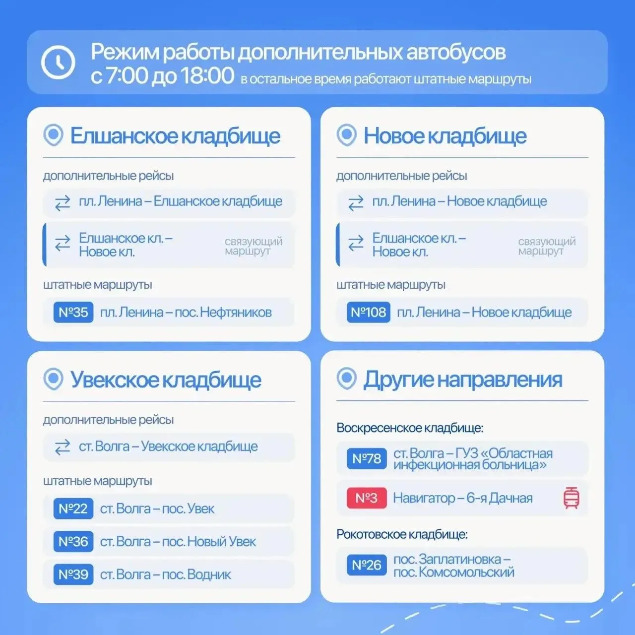 Завтра, 21 апреля, для перевозки местных жителей к саратовским кладбищам оганизуют работу общественного транспорта. Ознакомиться с расписанием можно в карточке выше