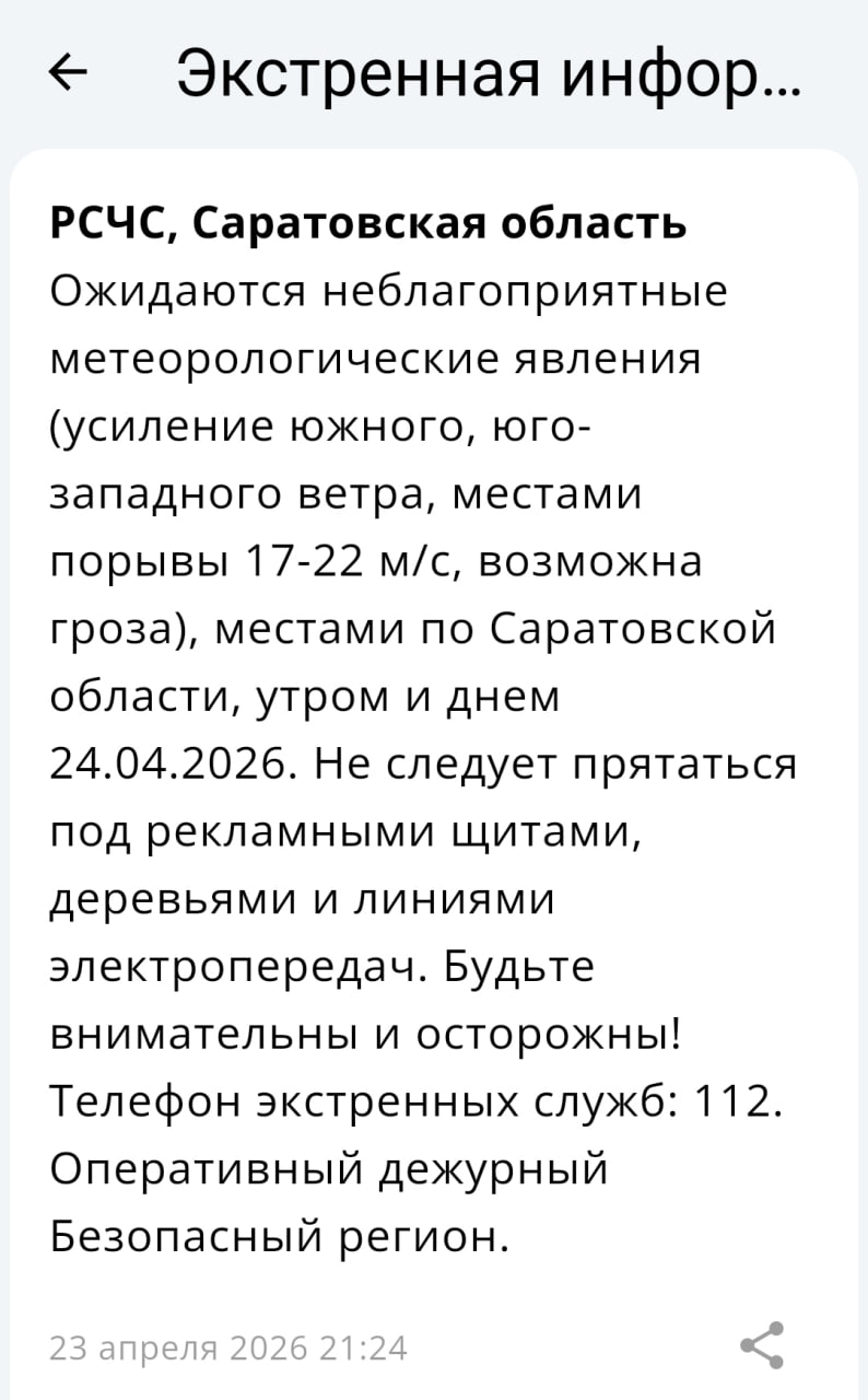 Внимание утром и днем 24.04.2026 местами по Саратовской области сохранится усиление южного, юго-западного ветра, местами порывы 17-22 м/с, возможна гроза. Днем 24.04.2026 в Саратове ожидается усиление южного, юго-западного ветра, порывы...