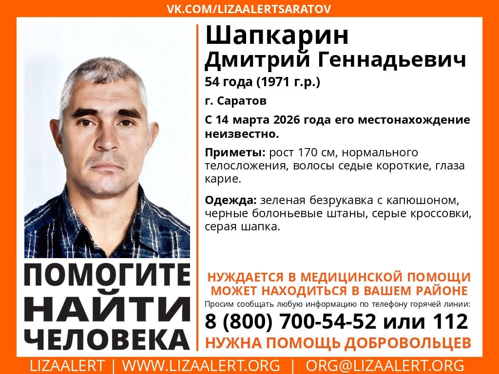 54-летний Дмитрий Шапкарин из Саратова пропал 14 марта 2026 года.