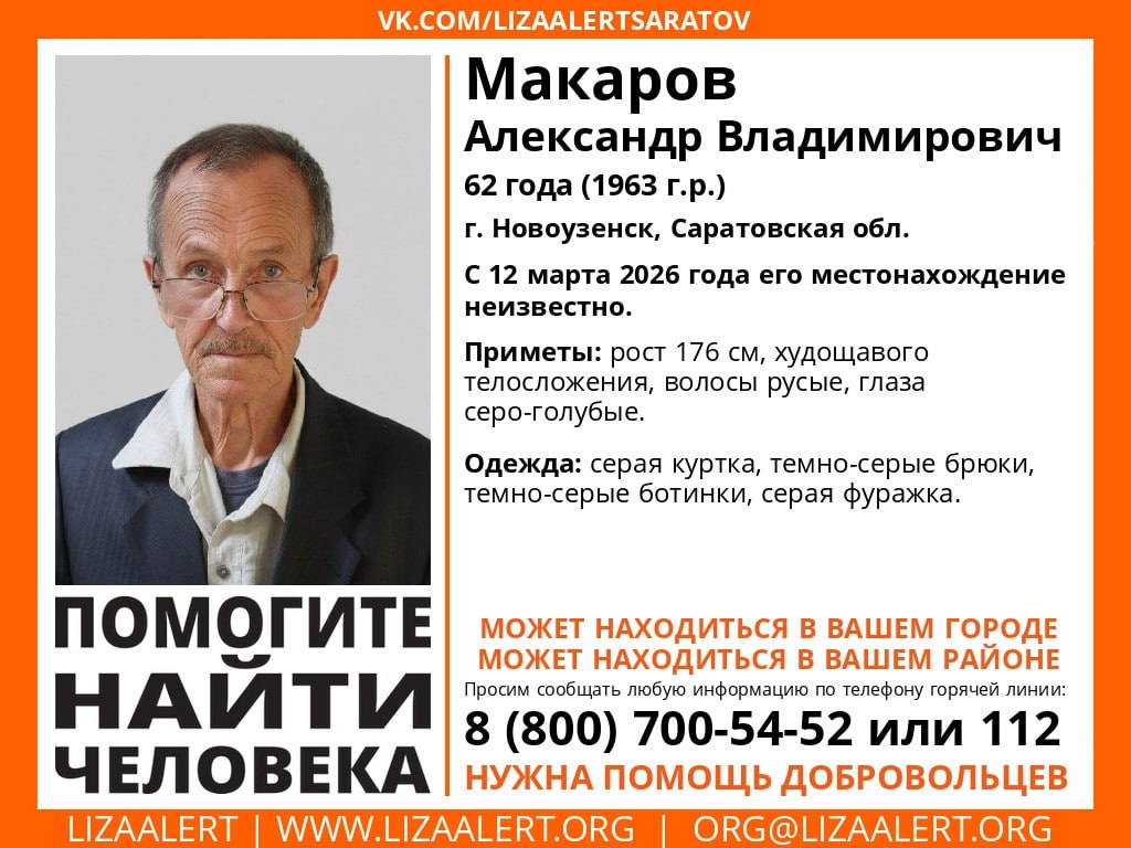 62-летний Александр Макаров из Новоузенска пропал 12 марта 2026 года.