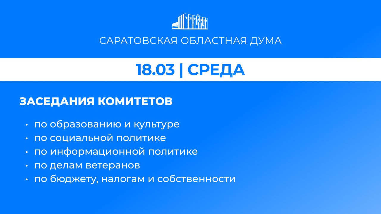 18 марта в Саратовской областной Думе запланированы заседания комитетов: