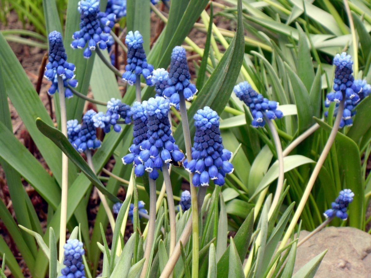 Некоторые сорта мускари хорошо выглядят под величественными лианами, такими как лимонник или ландыши, которые перекрывают увядающую листву. А в сочетании с голубыми хостами они создают незабываемую композицию.