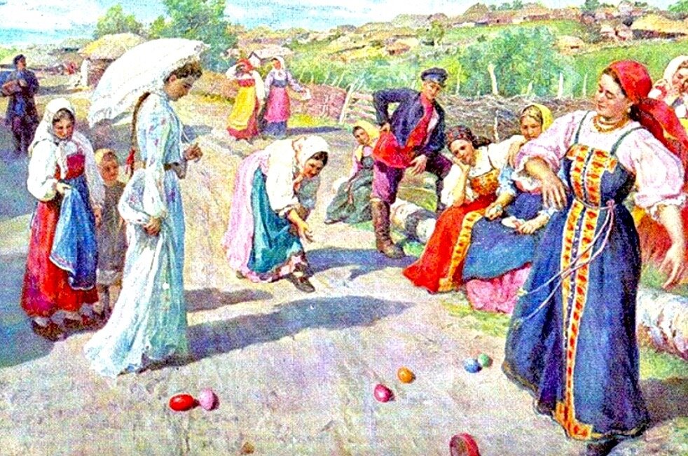 В отличие от шумных масленичных гуляний, пасхальные праздники проводились значительно более скромно, но не менее весело. Пасха была временем для ярмарок и различных забав, включая катание яиц с бугорков, которое пользовалось большой популярностью среди детей и взрослых. В богатых домах для этой игры использовали специально сконструированные лоточки, а победители могли рассчитывать на приятные призы.