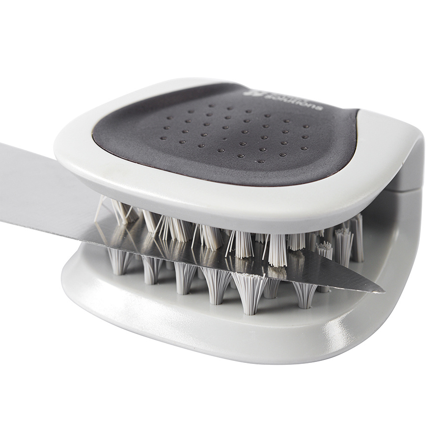 - Щетинки средней жесткости, выполненные из износостойкого нейлона, эффективно удаляют загрязнения, не повреждая лезвие. Это позволяет владельцам даже самых дорогих ножей быть уверенными в их сохранности.