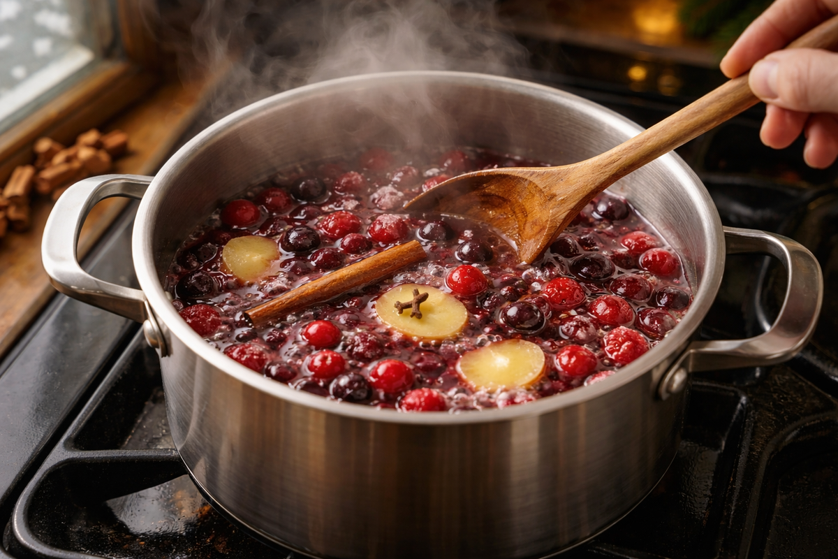 Сначала приготовьте ягодную основу, смешав ягоды, мелко нарезанный имбирь, корицу и гвоздику в кастрюле. Залейте 500 мл воды, доведите до кипения и варите на медленном огне 10 минут. Ароматы заполнят ваш дом!
