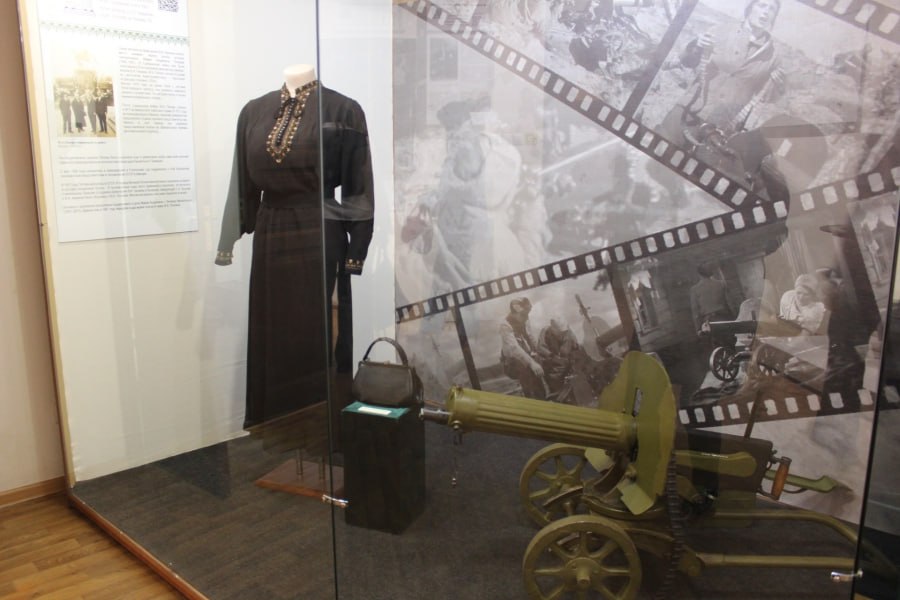 Дом-музей Чапаева представил на выставке черное платье, которое принадлежало Марии Поповой (1896-1981). В Гражданскую войну она была санитаркой в 25-й стрелковой дивизии под командованием Василия Чапаева. Именно эту женщину считают одним из прототипов Анки-пулеметчицы – персонажа из фильма «Чапаев» (1934).