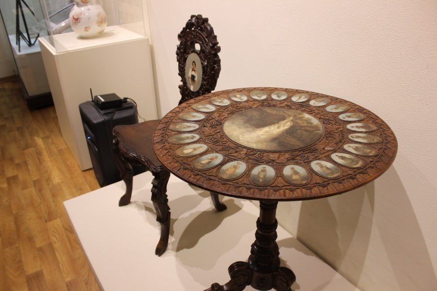 Новоузенский музей выставил предметы мебели, которые выполнены в духе национального романтизма. На данном экспонате передан образ местности городка Интерлакен в швейцарском кантоне Берн. Там в 1897 году остановился известный художник Василий Суриков, чтобы написать этюды к картине «Переход Суворова через Альпы». В центре стола находится изображение водопада в месте Лаутербруннен в округе Интерлакен, где расположена долина водопадов. Есть предположение, что это место вдохновило известного писателя Джона Толкина на создание своей вымышленной вселенной, которую он отразил в книгах «Хоббит» и «Властелин Колец».
