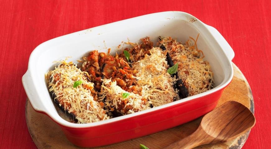 Шаг 6: Переложите баклажаны в форму для запекания и заполните их начинкой из чечевицы. Распределите оставшуюся начинку вокруг баклажанов, посыпьте пармезаном и хлебными крошками. Запекайте в духовке 30–35 минут, пока не образуется золотистая корочка.