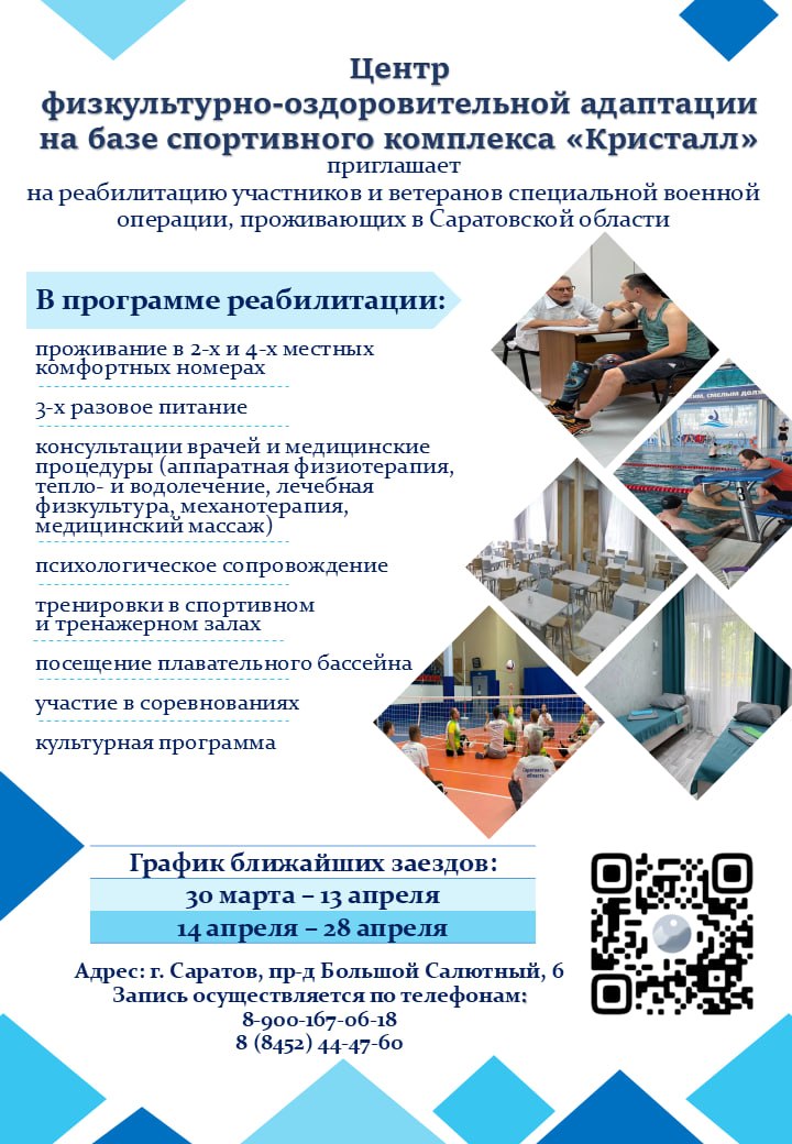 Центр реабилитации "Кристалл" г.Саратов приглашает участников и ветеранов специальной военной операции, проживающих в Саратовской области, на реабилитацию
