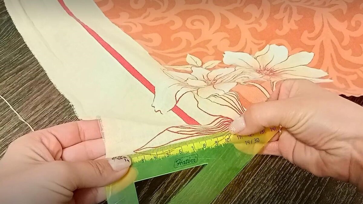 Теперь приступаем к сшиванию полосок ткани в одну длинную ленту. Рекомендуется соединять ткань по диагонали, чтобы стыки были практически незаметными и не образовывали утолщения. Излишек ткани следует удалить.