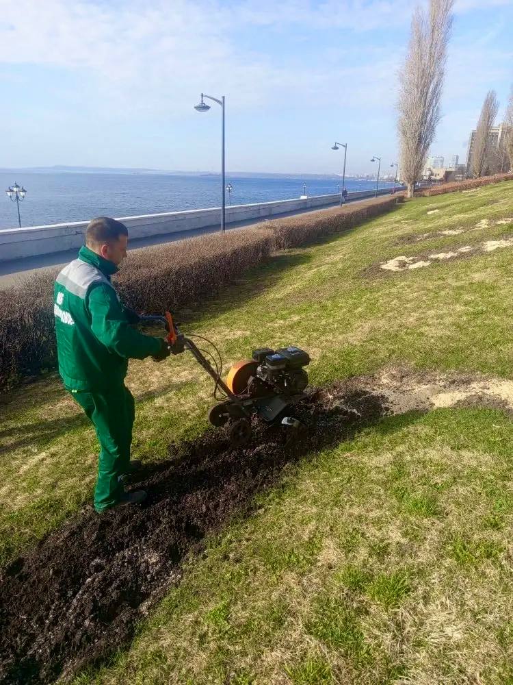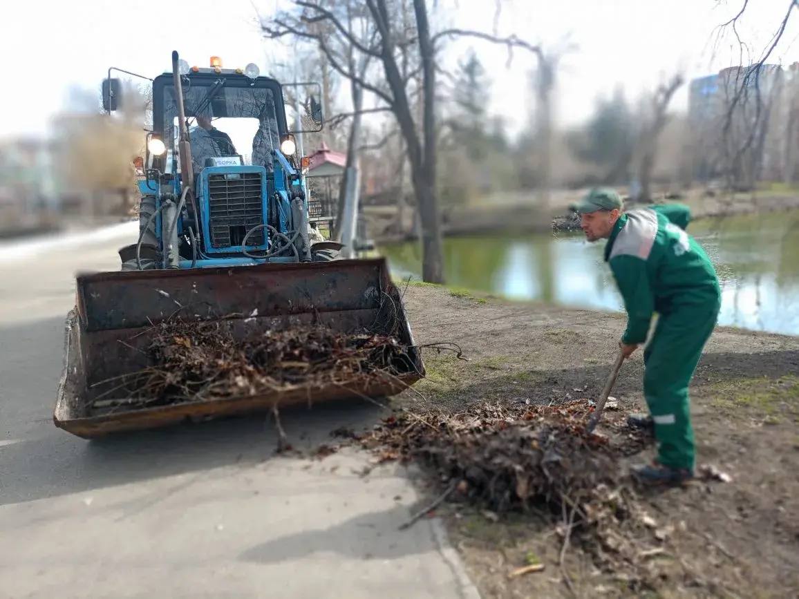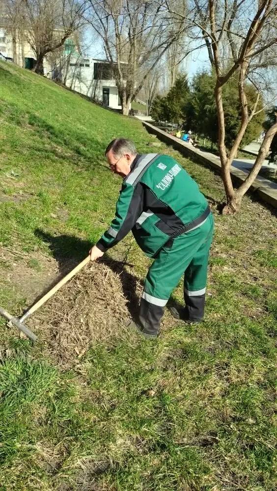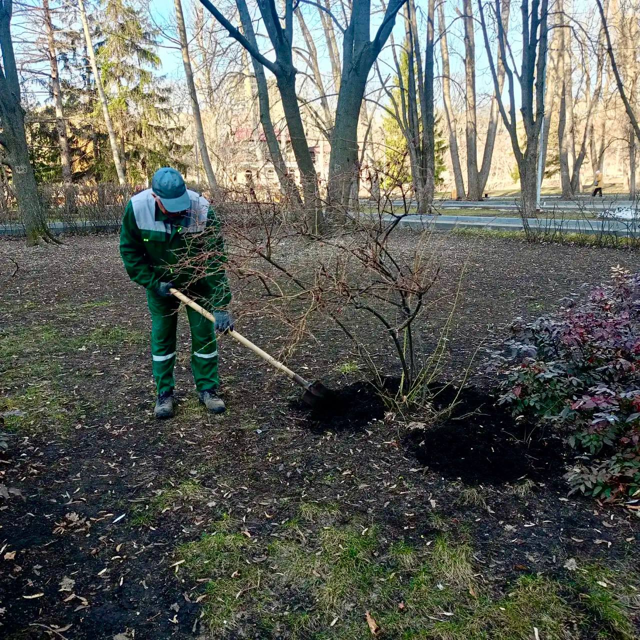 Специалисты службы благоустройства работают на зелёных зонах: убирают листву и ветки, перекапывают приствольные круги деревьев, культивируют почву и открывают розы после зимы.
