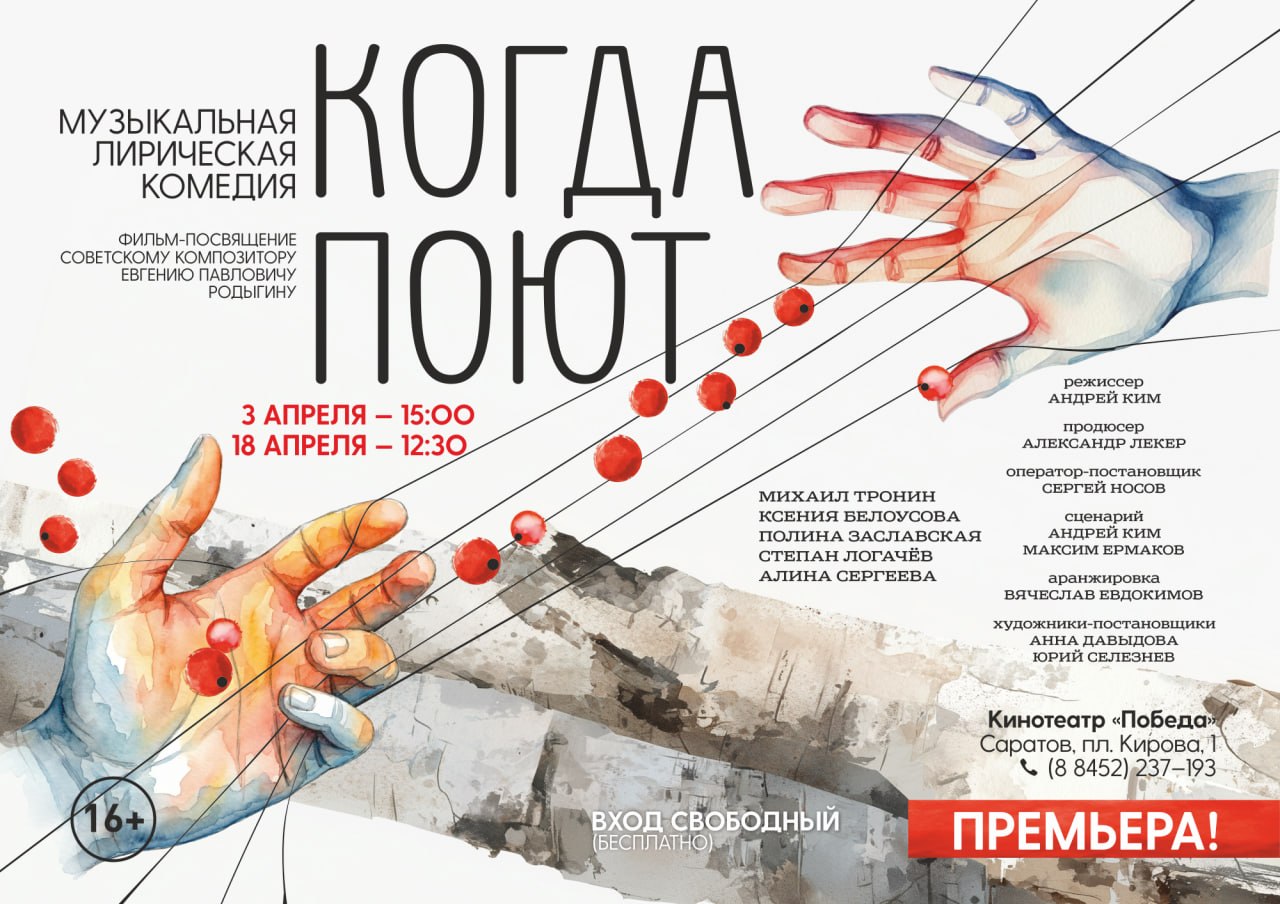 В кинотеатре "Победа" (Саратов, площадь Кирова, 1)3 апреля в 15:00 и 18 апреля в 12:30 состоится премьера фильма "Когда поют". Это музыкальная комедия, посвященная советскому композитору Евгению Родыгину (автор песен "Белым снегом", "Рябинушка", "Едут новоселы"). Фильм снимали в прошлом году.