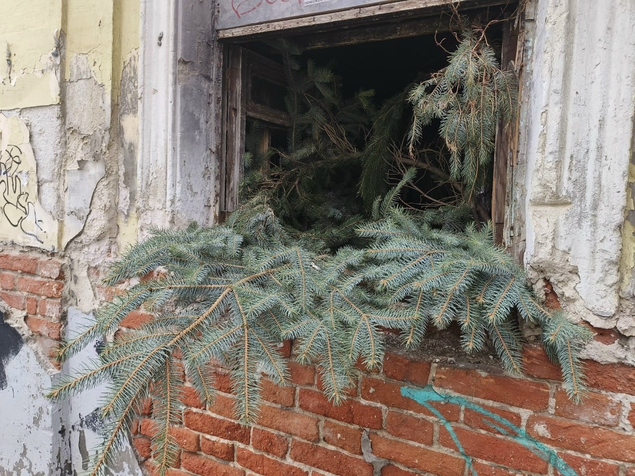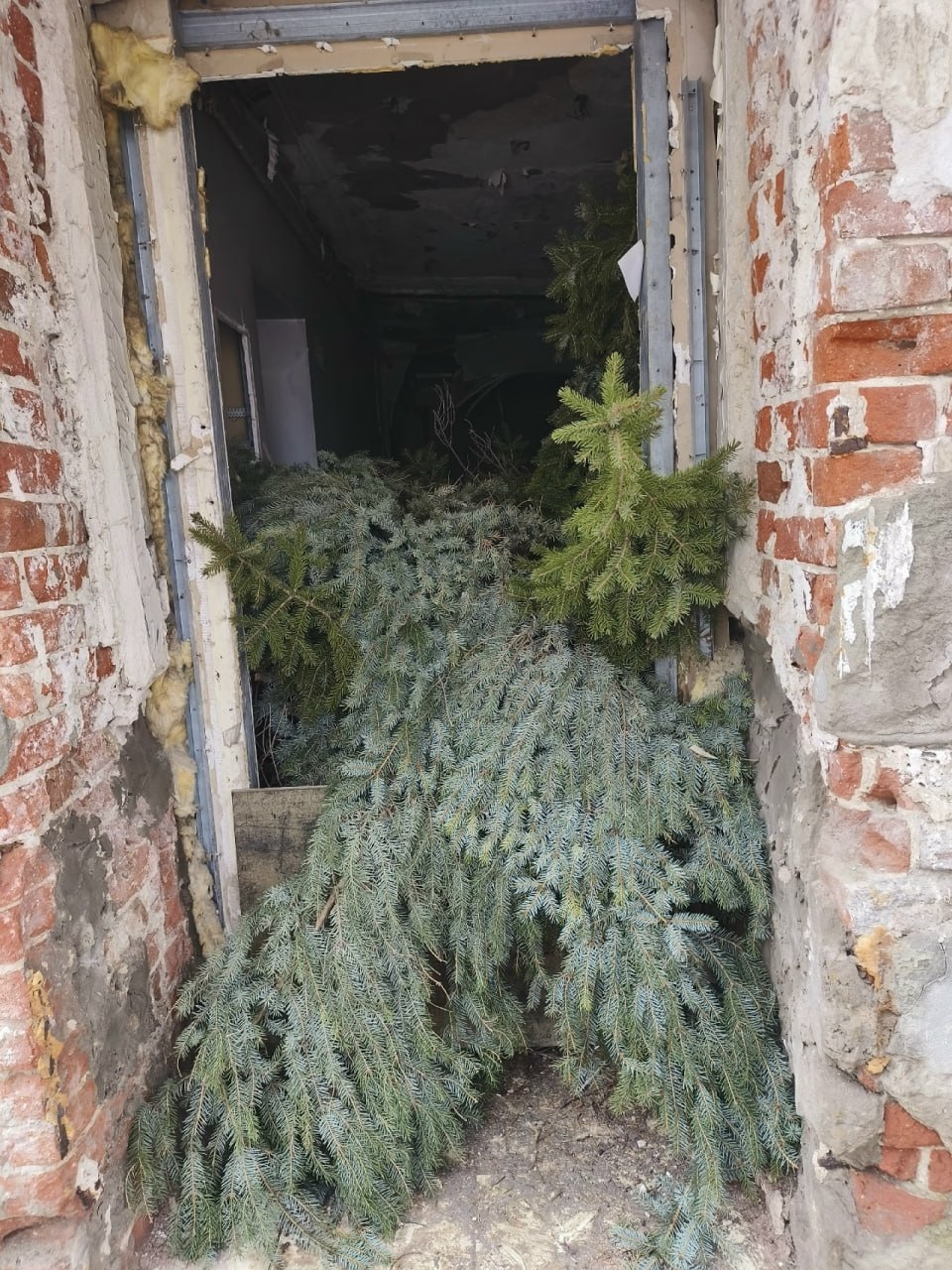 В здание и раньше бросали различный мусор, а теперь из дверного проема и окон торчат ветви елок – их там много.