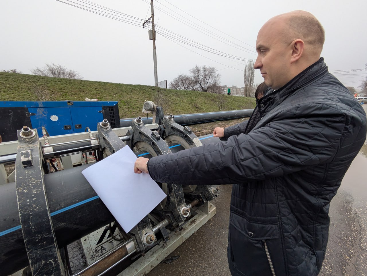 Большой объём работ ведётся на участке улицы Техническая от Шехурдина до 50 лет Октября. Сложность в том, что большая часть водопровода меняется под железнодорожными путями и гаражами – делаются проколы и протаскивание труб широкого диаметра. Зайцев на примере готовящихся к укладке труб рассказал о технологии их спайки. Трубы полиэтиленовые, их сваривают специальной аппаратурой под высокой температурой, чтобы исключить порывы. Производитель даёт на них 50 лет гарантии и заявляет о столетнем сроке эксплуатации.
