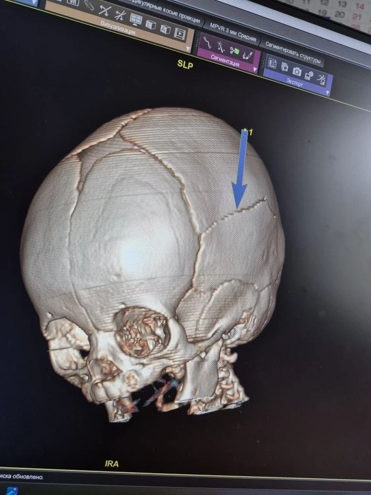 В минувшую субботу в больницу обратились родители 5-месячного ребенка. Днем ранее малыш упал с кровати. Сначала поведение ребенка не изменилось. Однако мать заметила небольшую припухлость на голове. Рентген в частном медцентре вызвал подозрение на повреждение костей черепа, и пациента экстренно направили в больницу.