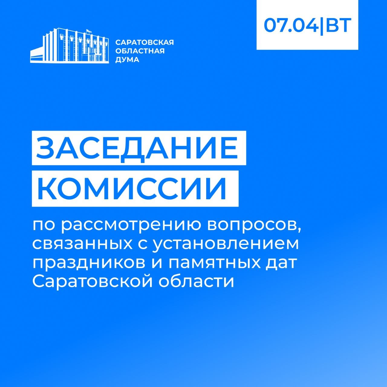 7 апреля в Саратовской областной Думе состоится заседание комиссии по рассмотрению вопросов, связанных с установлением праздников и памятных дат Саратовской области.