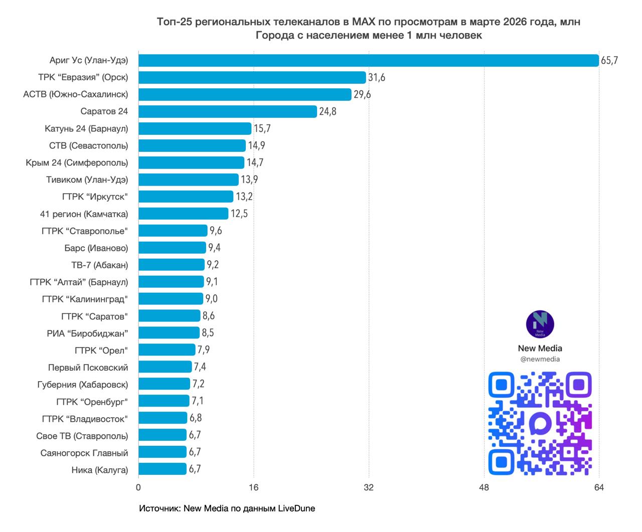 По результатам рейтинга "Топ-25 региональных телеканалов по просмотрам в MAX в марте 2026 года" от телеграм-канала New Media, канал "Саратов 24" вошел в пятерку лидеров по количеству просмотров.