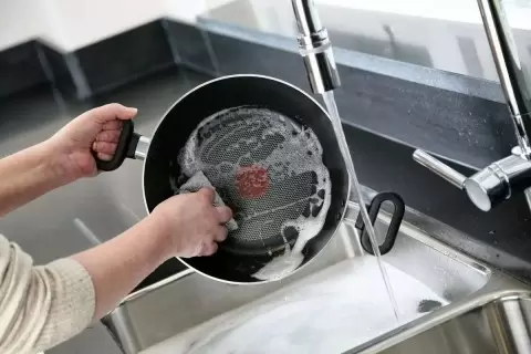 - Вручную мыть сковородки лучше всего, дождавшись, пока они полностью остынут — резкий перепад температуры может привести к трещинам.