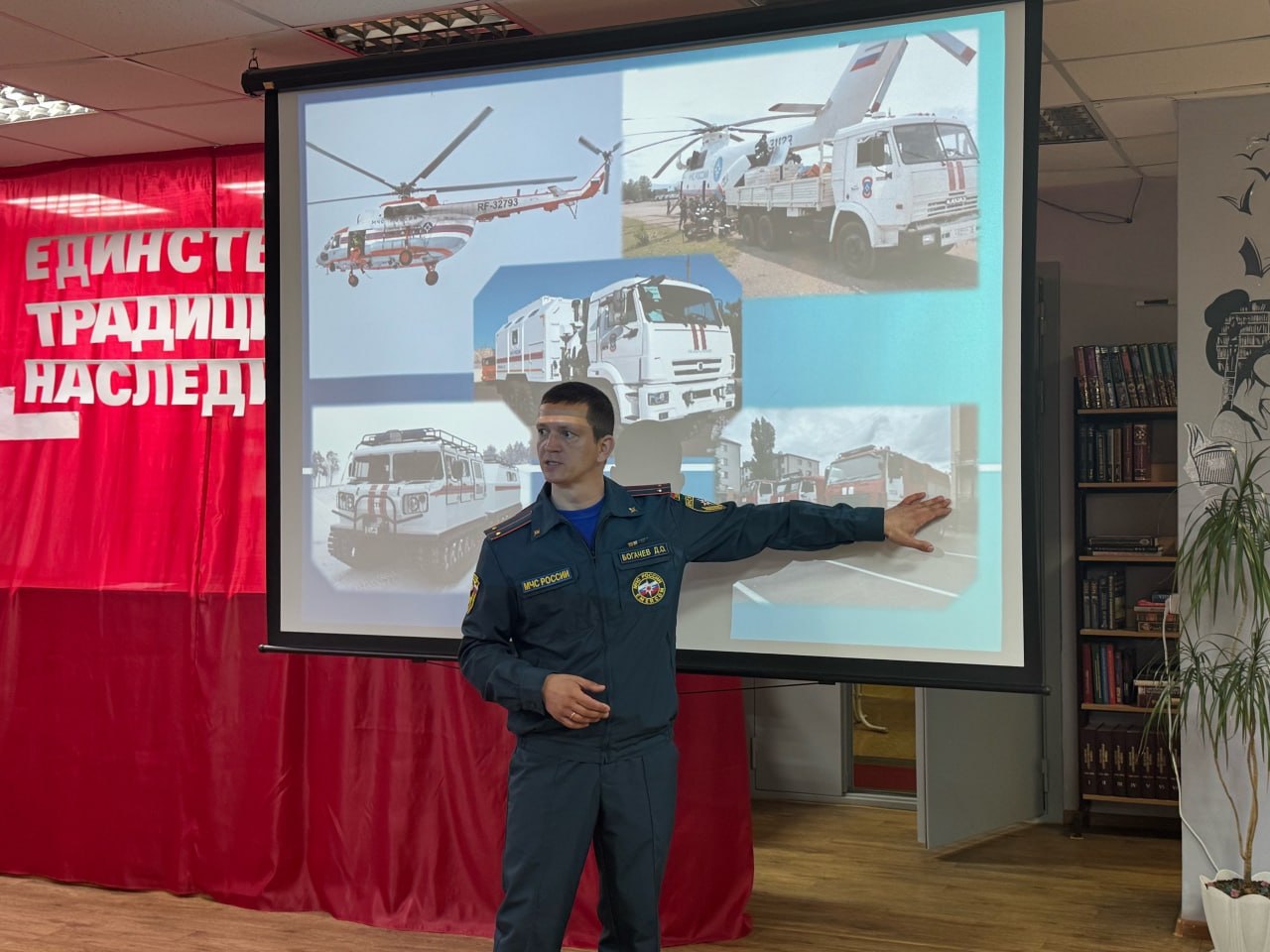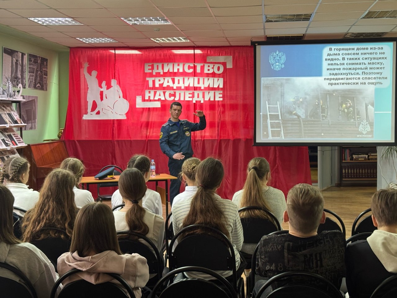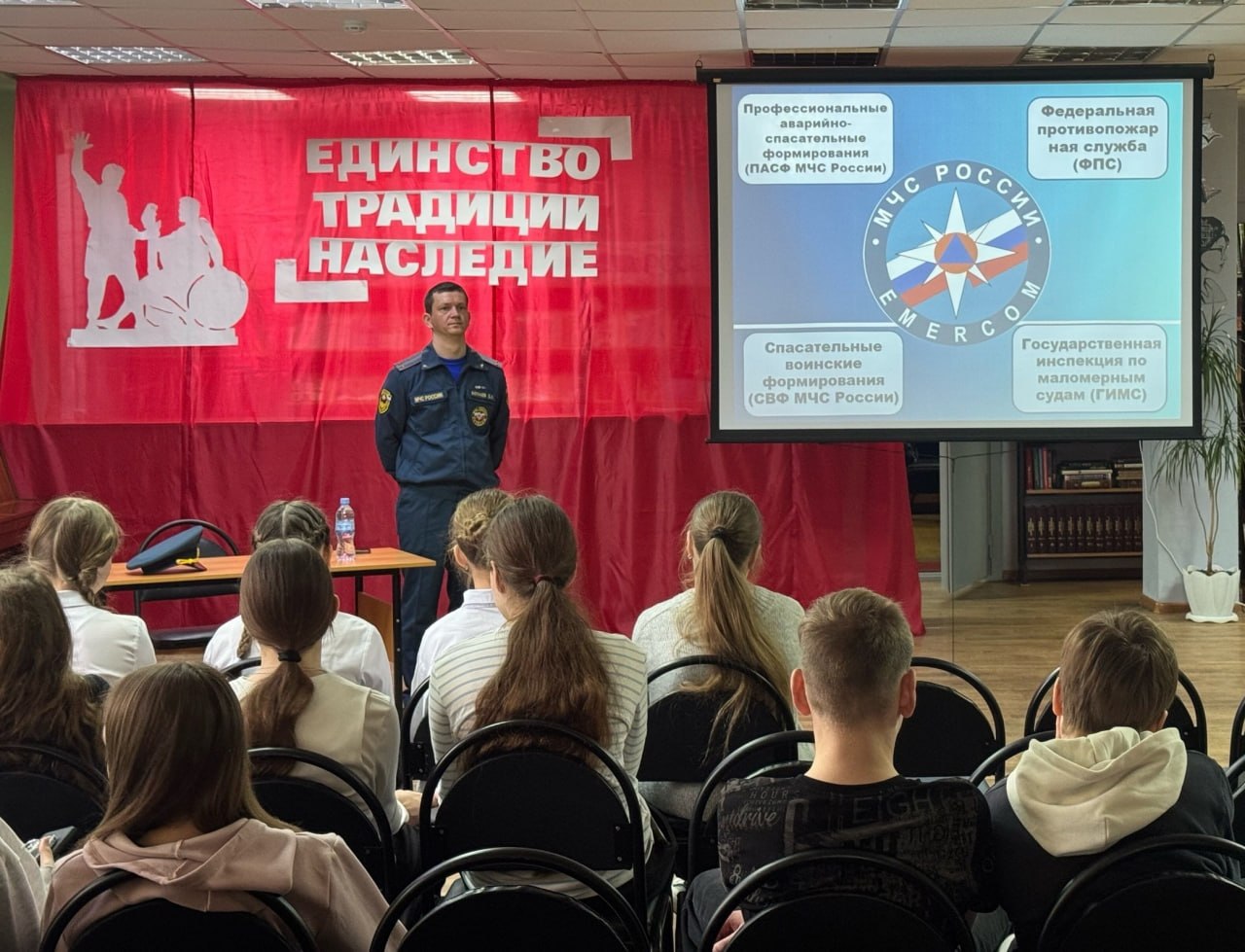 В начале мероприятия библиотекарь познакомил ребят с деятельностью Министерства Российской Федерации по делам гражданской обороны, чрезвычайным ситуациям и ликвидации последствий стихийных бедствий: рассказал об истории создания ведомства и его ключевых подразделениях. Особое внимание было уделено Федеральной противопожарной службе — её задачам, структуре и ежедневной работе.
