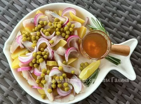 4. Добавьте консервированный горошек, создавая яркие акценты в блюде. Приготовьте заправку, смешав подсолнечное масло, лимонный сок и горчицу, и подайте её в отдельном соуснике – это добавит шарма.