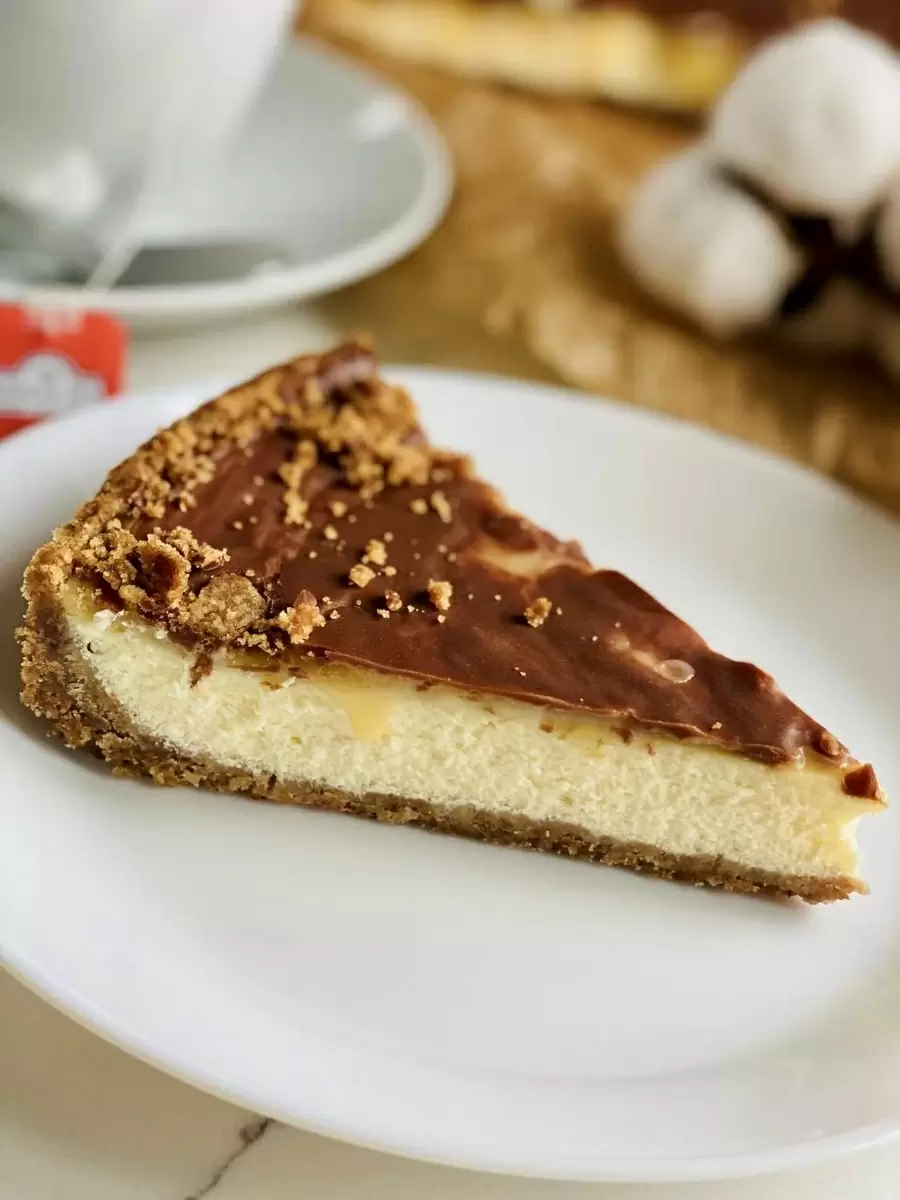 На последнем этапе, растопите шоколад на водяной бане вместе со сливочным маслом. Полученной глазурью полейте чизкейк и оставьте до полного застывания.