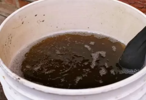 - Приготовление: наполните емкость водой на две трети, добавьте мелассу и перемешайте. Поместите компост в тканевый мешок и опустите в воду. Чтобы насытить раствор кислородом, поднимайте и опускайте мешок несколько раз в день.