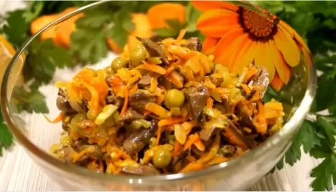 Этот рецепт восхитительного салата основан на гармоничном сочетании куриных сердечек, сладостных моркови и лука, а также сочного зеленого горошка. Ароматные специи добавляют этому блюду волшебный шарм! Итак, вот как создать этот кулинарный шедевр.
