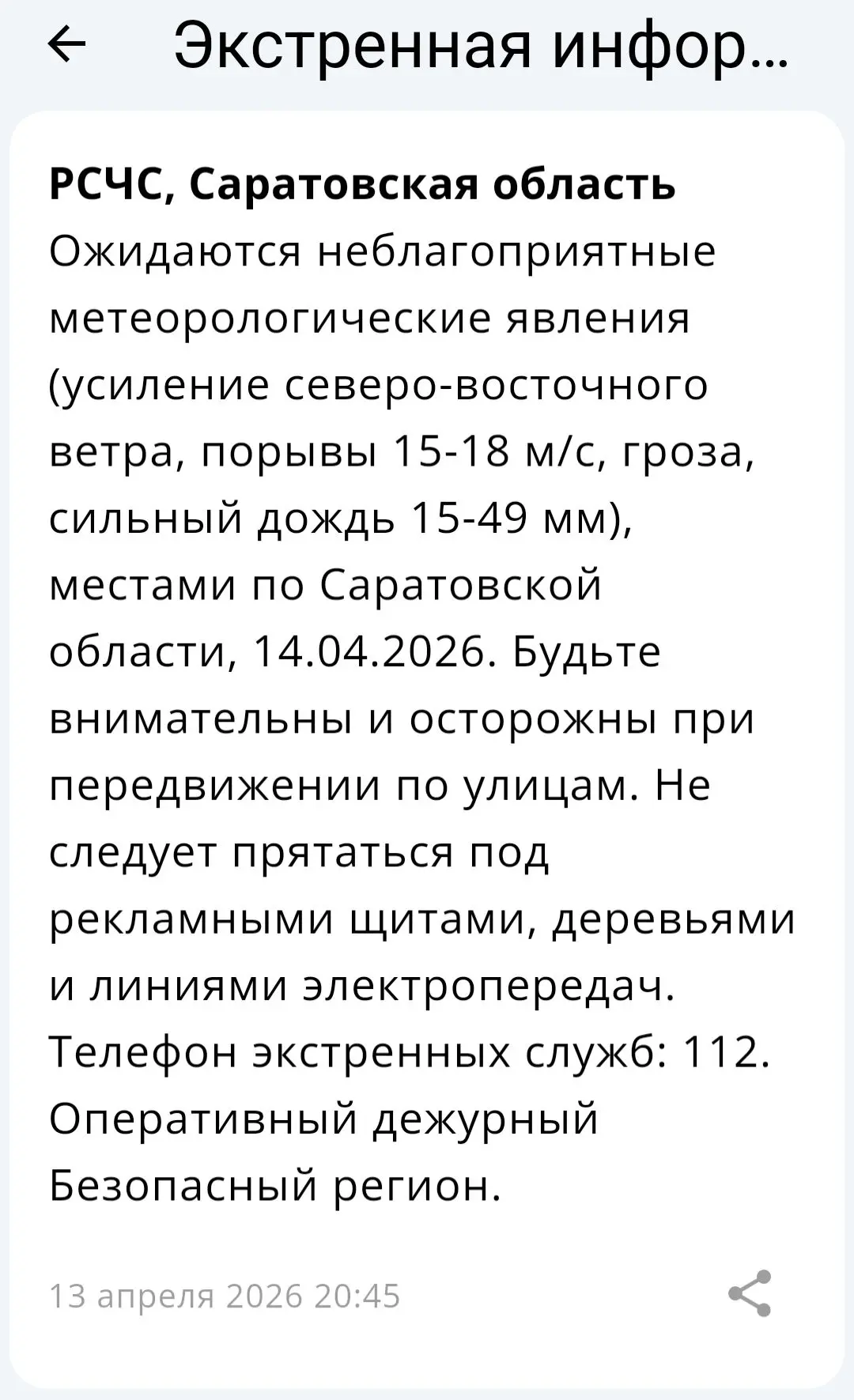 Предупреждение о непогоде от РСЧС