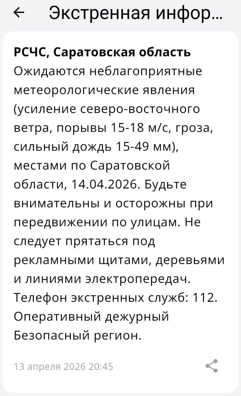 Внимание ночью и днем 14.04.2026 местами по Саратовской области и в г.Саратове ожидается усиление северо-восточного ветра, порывы 15-18 м/с. Ночью и утром 14.04.2026 местами по Саратовской области в г. Саратове ожидается...
