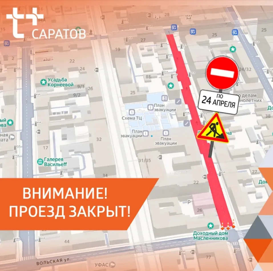 Движение закрыто между Вольской и Горького. Причина — ремонт подземного трубопровода. Обещают открыть проезд до конца дня 24 апреля.