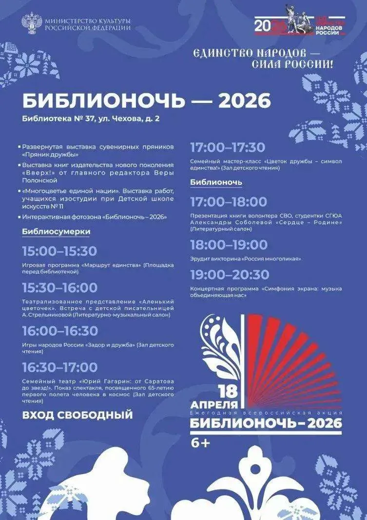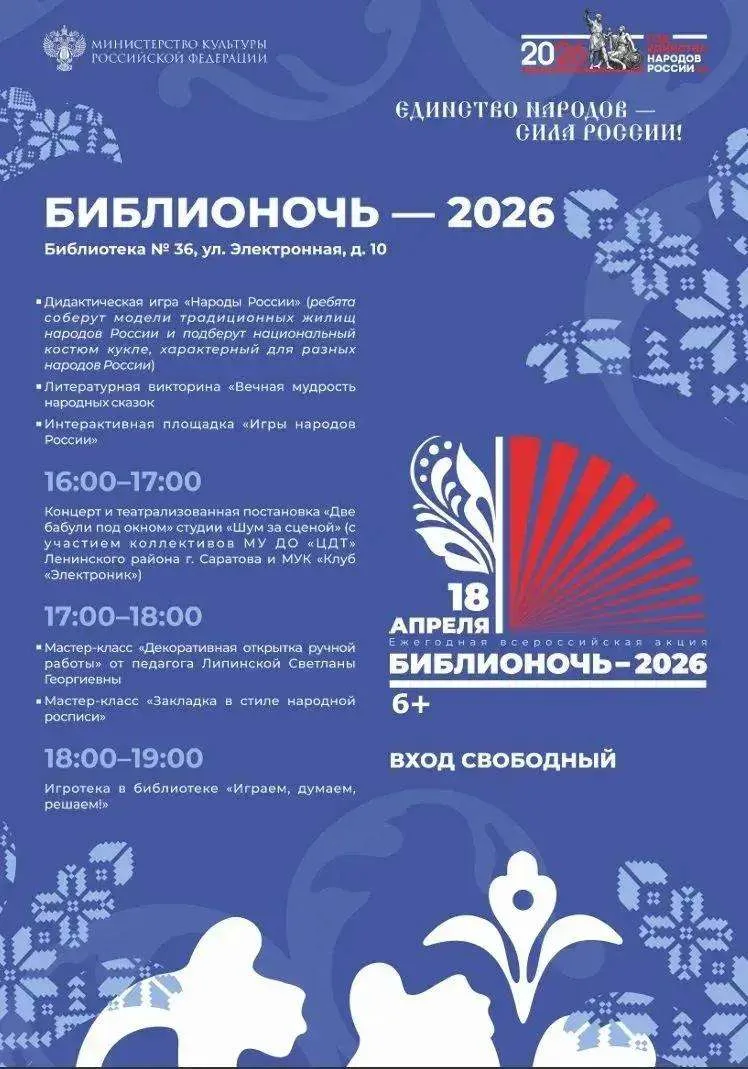 В рамках Всероссийской акции 18 апреля саратовцев ждет насыщенная программа: литературные викторины, творческие мастер-классы, встречи с писателями и поэтами, а также уютные чтения и музыкальные вечера.
