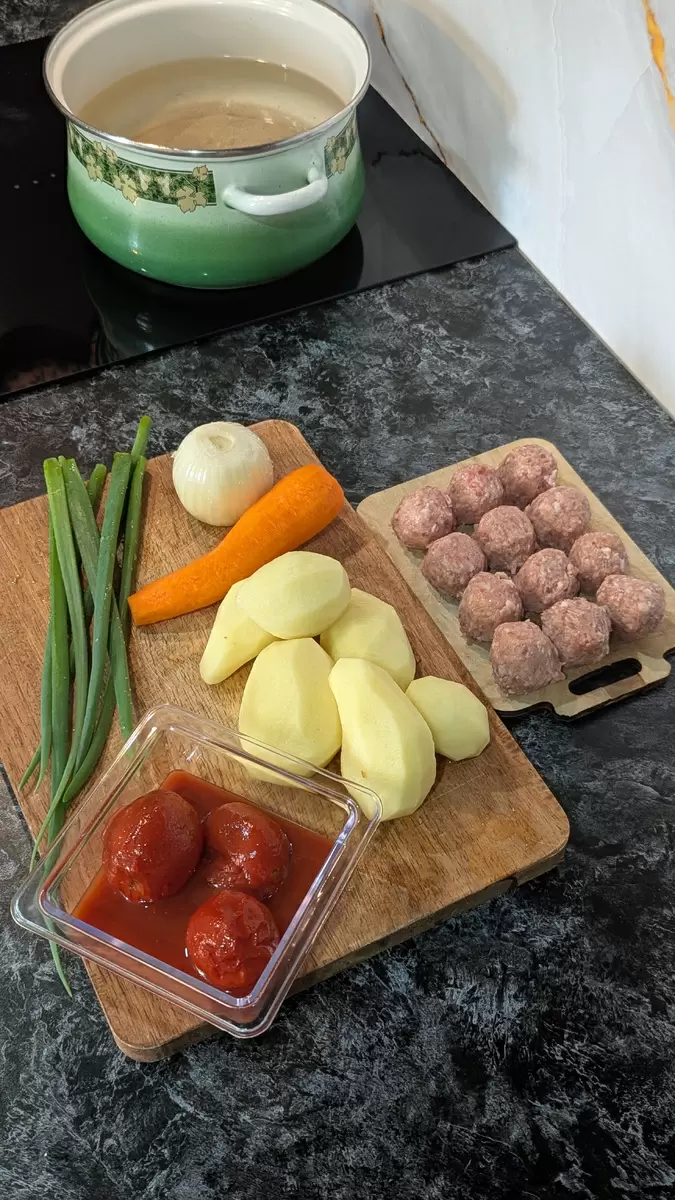 Помидоры из банки размять вилкой и добавить к пассерованным овощам, пусть потушатся еще пару минут. Перенесите овощную смесь в бульон с картофелем и варите все вместе еще 10 минут.