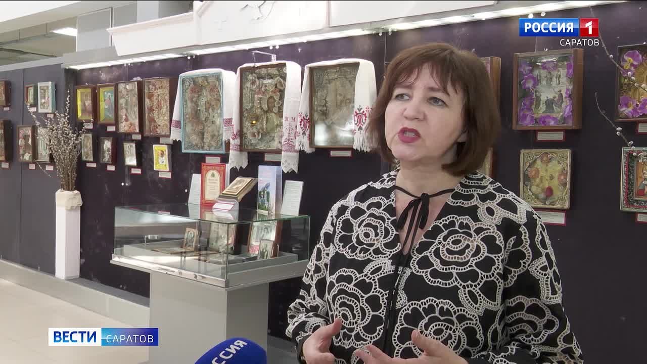 Она знакомит посетителей с православными фолежными иконами, которые были созданы в конце XIX – начале XX века и в Советском союзе. Всего их представлено более 50, они собраны из Свято-Алексиевского женского монастыря, музея истории Саратовской митрополии, музея Свято-Троицкого кафедрального собора, из Свято-Воскресенского собора Пугачева и из частных коллекций.