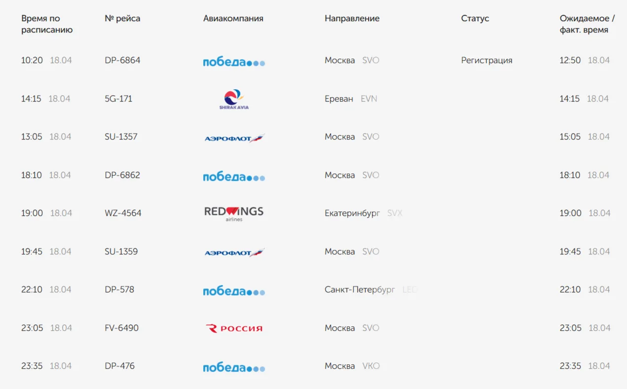 Сейчас задерживают два рейса на прилет и вылет в Москву. Актуальную информацию можно посмотреть на онлайн-табло.