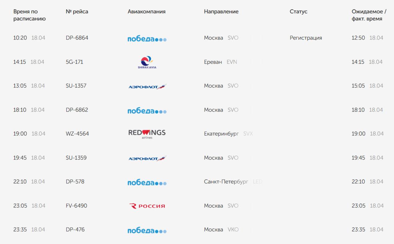 Сейчас задерживают два рейса на прилет и вылет в Москву. Актуальную информацию можно посмотреть на онлайн-табло