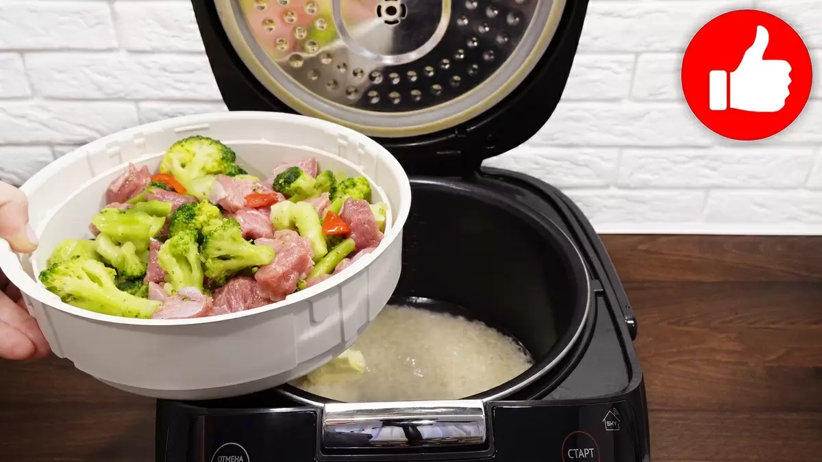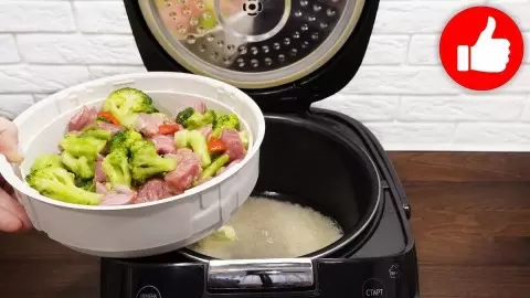 3. Рабочая поверхность устанавливает корзину пароварки с индейкой и овощами сверху на рис.