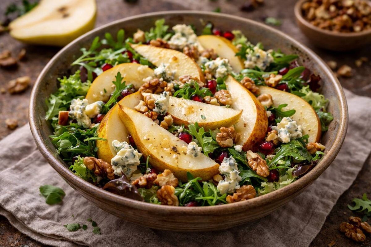 Сочетание ингредиентов может показаться непривычным, но на самом деле оно невероятно гармонично. Сладкая груша, выразительный сыр, хрустящие орехи и лёгкая заправка создают свежий и сбалансированный вкус, идеальный для праздничного стола.