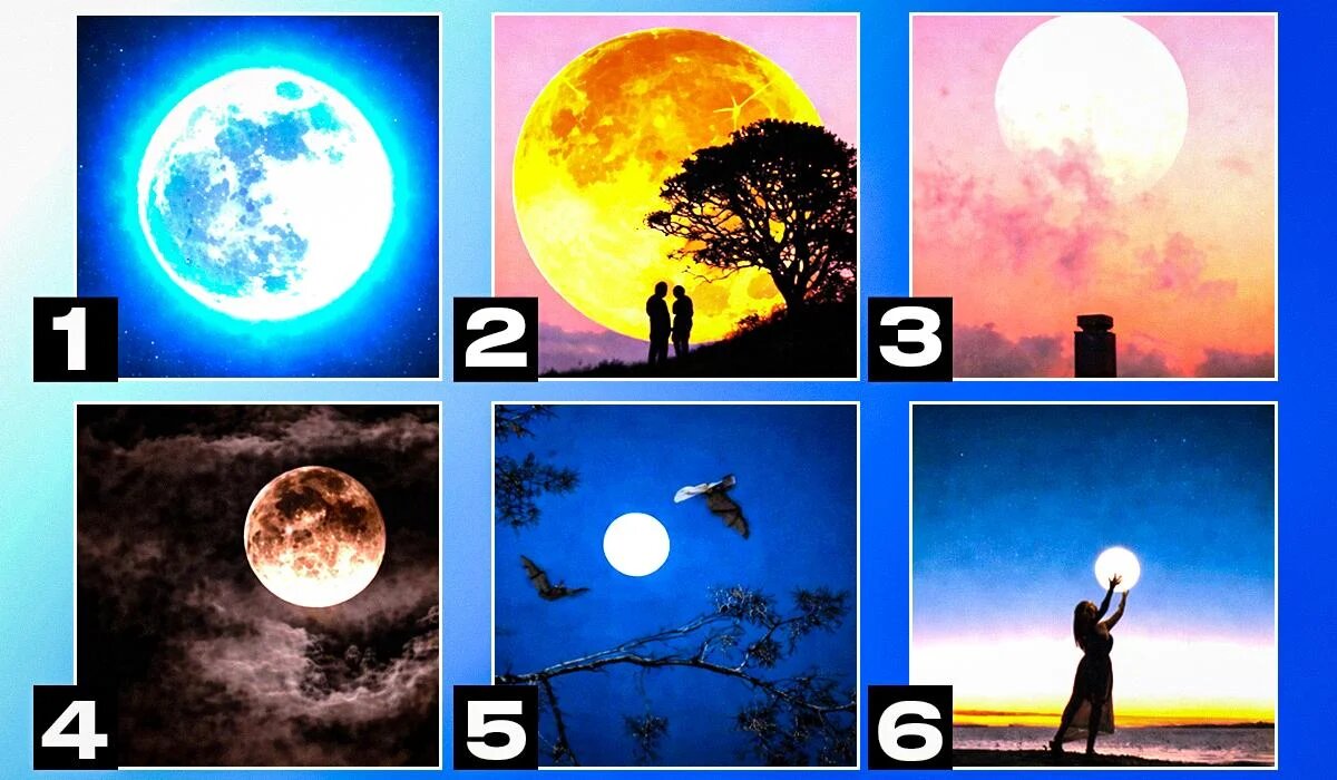 На выбор вам представлены шесть красивых изображений Луны. Вам нужно выбрать одно, которое вызывает у вас наибольший интерес. Постарайтесь быть честными с собой и не пытайтесь выбрать «правильный» вариант.