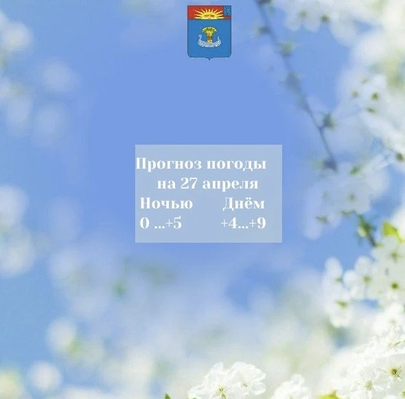 27.04.2026 года ночью: облачно с прояснениями. Небольшой дождь, местами умеренный. Ветер южный 8-13 м/с, порывы 17-22 м/с. Температура 0...+5°, на возвышенных местах и в Левобережье до +10°.