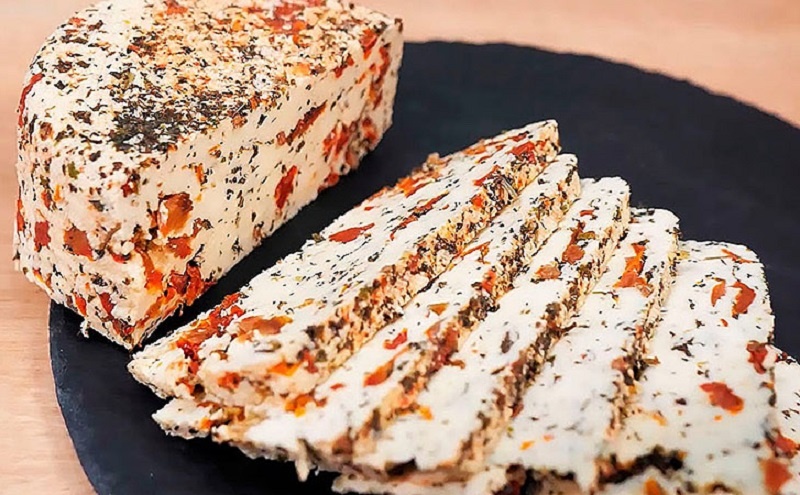 Делим основу на две части и сразу добавляем начинки: для первого варианта — измельчённые вяленые помидоры и базилик; для второго — орехи. Затем масса отлеживается под прессом, чтобы убрать лишнюю влагу и окрепнуть для нарезки. Остужаем и подаём — на тарелке два контраста вкусов, выглядящие аппетитно и не перегруженные костями времен.